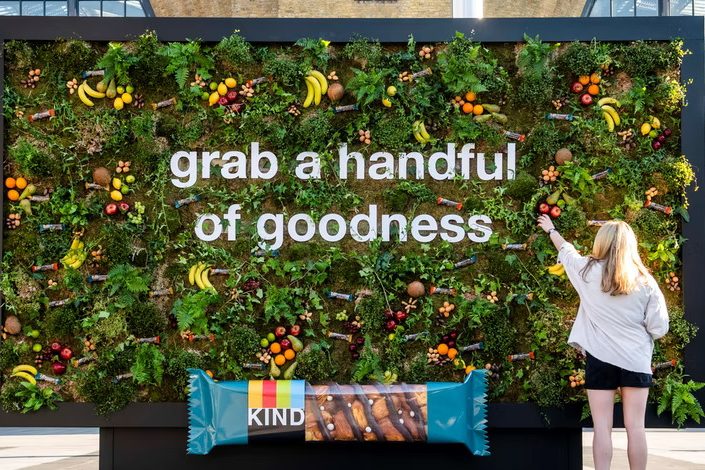 Một bảng quảng cáo kỳ lạ với trái cây kèm theo các thanh ngũ cốc. …